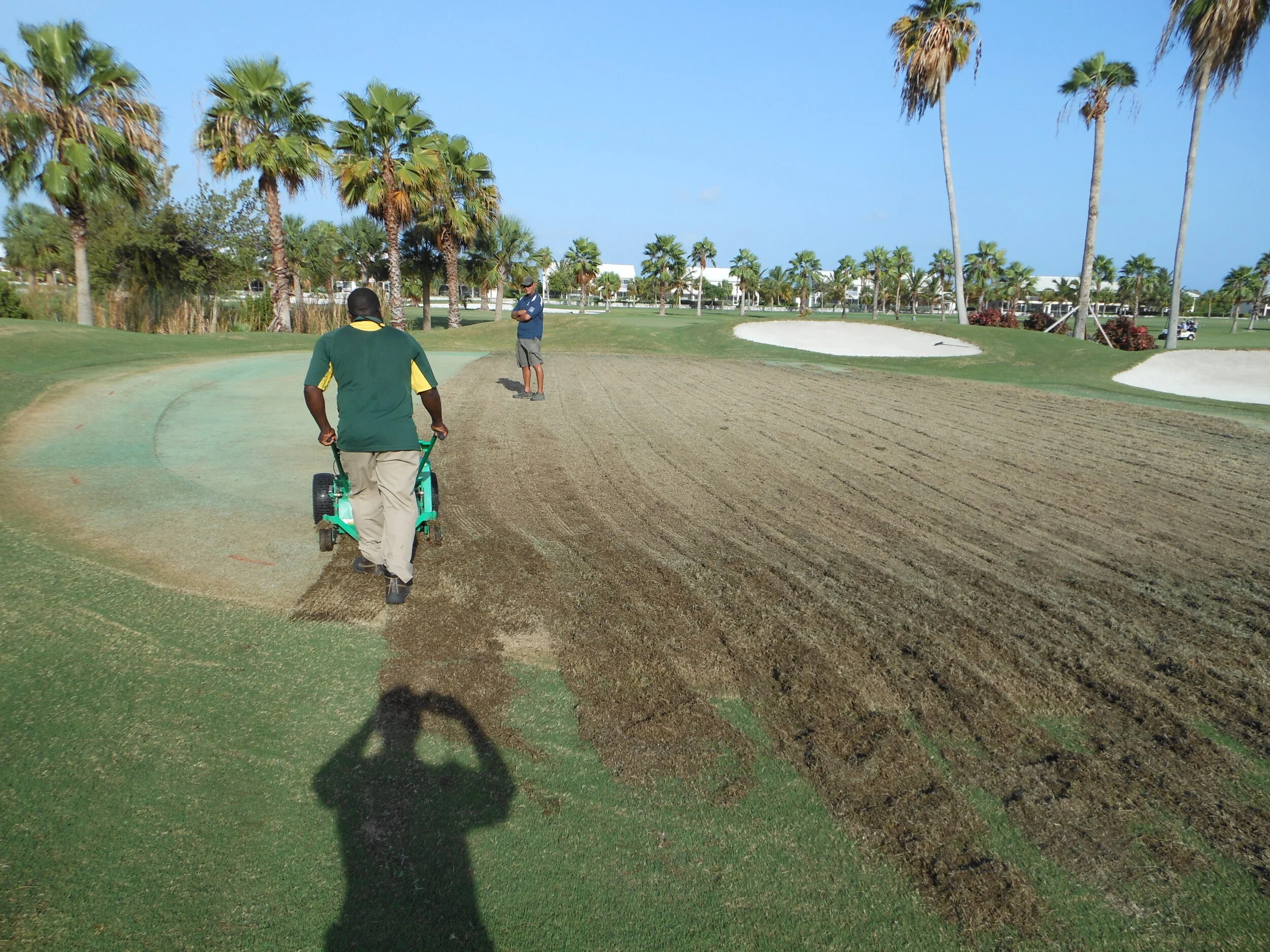 Triple verticutting dead greens to prep for sprigs